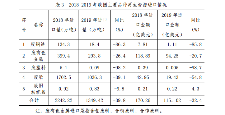2019 年,我國廢鋼鐵、廢有色金屬、廢塑料、廢紙、廢舊紡織品五大品種再生資源出口量 40.66 萬噸,同比下降 40.2%。2018-2019年我國主要品種再生資源出口情況如表4 所示。