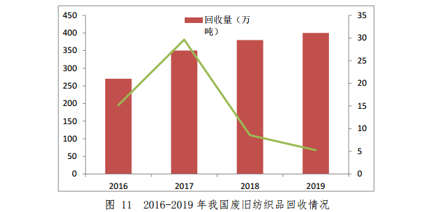 2019 年,我國棉、化纖和絲三類紡織纖維加工量約6610萬噸。據(jù)估算,每年產(chǎn)生廢舊紡織品超過 2000 萬噸,一類是消費(fèi)前工業(yè)加工領(lǐng)域的邊角料等,基本得到再生利用,另一類是閑散在居民手中的大量廢舊衣物和紡織品,再生利用率約 15%。2019年,我國廢舊紡織品回收量約為 400 萬噸, 同比增長(zhǎng) 5.3%。2016-2019年我國廢舊紡織品回收情況如圖 11 所示。