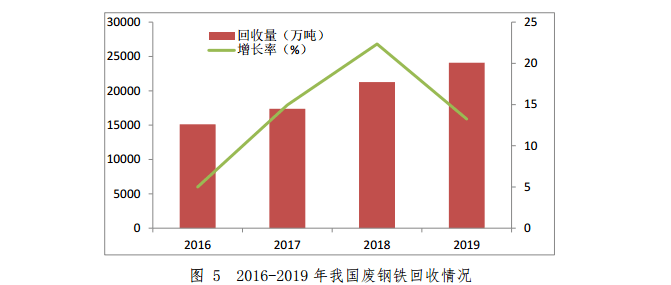 2019年,我國粗鋼和鋼材產(chǎn)量分別為9.96億噸和12.05億噸,同比增長(zhǎng)8.3%和9.8%,粗鋼產(chǎn)量再創(chuàng)歷史新高;回收廢鋼鐵約24097萬噸1,同比增長(zhǎng)13.3%。其中,重點(diǎn)大型鋼鐵企業(yè)回收廢鋼鐵約21597萬噸,同比增長(zhǎng)15.0%;其他企業(yè)回收廢鋼鐵約2500萬噸,與2018年持平;廢鋼單耗為216.7kg/t 鋼,同比增加14.4kg/t鋼,增幅為7.1%,綜合廢鋼比21.67%, 同比增加1.49個(gè)百分點(diǎn)。2016-2019年我國廢鋼鐵回收情況如圖5所示。