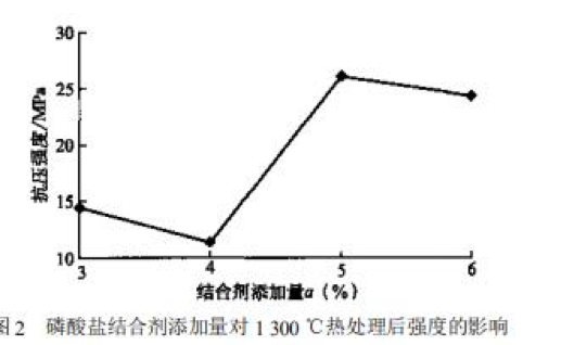 圖1、圖2是以磷酸鹽為結(jié)合劑、Al-80水泥為固化劑的四個(gè)配方試樣的性能檢測結(jié)果,隨著結(jié)合劑添加量的增大,110℃×24h烘干后澆注料試樣的抗壓強(qiáng)度呈上升趨勢,但在≤4%和≥5%的添加量范圍內(nèi),隨結(jié)合劑添加量的增加試樣的抗壓強(qiáng)度增大幅度很小,而在4%~5%的范圍內(nèi),抗壓強(qiáng)度隨結(jié)合劑添加量的增加而急劇提高。對于經(jīng)1300℃熱處理后的試樣,結(jié)合劑添加量在≤4%和≥5%的范圍內(nèi),試樣的抗壓強(qiáng)度隨結(jié)合劑的增加而呈微弱的下降趨勢,但抗壓強(qiáng)度隨結(jié)合劑添加量的增加而急劇提高。綜合可見,對于本實(shí)驗(yàn)選擇的原材料與實(shí)驗(yàn)范圍內(nèi),磷酸鹽結(jié)合劑合理的添加量為4%~5%。
