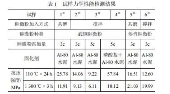 表1是以不同種類、不同添加量的硅微粉為結(jié)合劑和以磷酸鹽、Al-80水泥為固化劑的澆注料力學(xué)性能檢測結(jié)果。由表1可見,硅微粉的種類、加入方式、添加量以及固化劑種類對試樣的力學(xué)性能影響較大。由1#、2#試樣和5#、6#試樣的檢測結(jié)果可見,與硅微粉的直接攪拌加入方式相比,共磨加入方式能明顯改善澆注料的力學(xué)性能。由3#、4#試樣的檢測結(jié)果可見,固化劑種類對澆注料性能影響較大,并可看出磷酸鹽與Al-80水泥組成的復(fù)合固化劑具有明顯改善修補(bǔ)料性能的效果,而Al-80水泥則效果不明顯。由2#、3#試樣的檢測結(jié)果可見,硅微粉添加量的提高未能提高澆注料的力學(xué)性能。由采用相同的加入方式而硅微粉來源不同的1#、5#和2#、6#試樣的檢測結(jié)果可見,??瞎栉⒎叟c武鋼硅微粉相比,能明顯改善澆注料熱處理后的力學(xué)性能,并且添加??瞎栉⒎鄣臐沧⒘峡箟簭?qiáng)度隨試樣的熱處理溫度的提高而不斷增大。綜合可見,宜采用??瞎栉⒎圩鳛殒V質(zhì)澆注料的結(jié)合劑,合適的添加量應(yīng)為3c%左右。