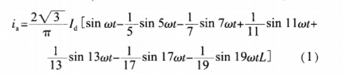 中頻電源注入電網(wǎng)的諧波主要是由整流裝置產(chǎn)生的.這里以三相6脈動全控橋式整流電路為例來分析其諧波含量忽略三相橋式晶閘管整流電路換相過程和電流脈動.假定交流側(cè)電抗為0.直流電感為無窮大,利用傅里葉分析方法,將電流負、正兩半波的中點作為時間零點,可推出交流側(cè)a相電流的表達式:
