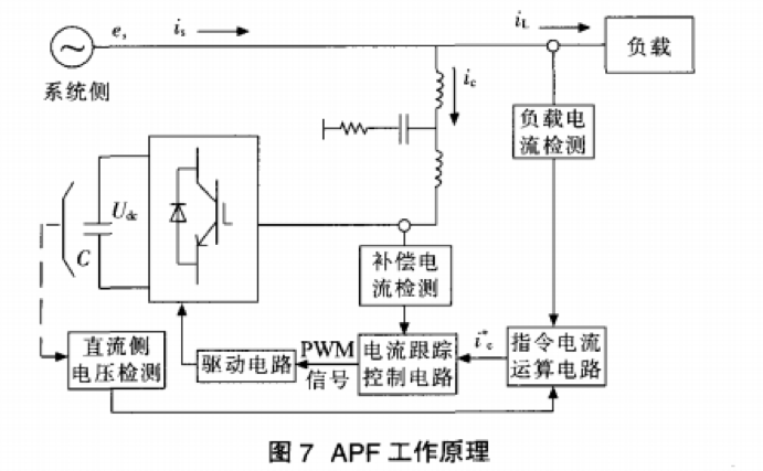 APF的工作原理如圖7所示。指令電流運算電路,一方面為達到消除諧波和補償無功功率的目的,將負載電流,中的諧波電流和無功電流分離出來,產(chǎn)生調(diào)節(jié)信號;另一方面為保持直流側(cè)電容電壓穩(wěn)定.采用PI調(diào)節(jié)控制法:將檢測到的電容電壓實際值與給定的參考電壓值相減之差通過PI調(diào)節(jié)器得到調(diào)節(jié)信號,并將作為實際的補償電流指令值疊加到i。上,即:
