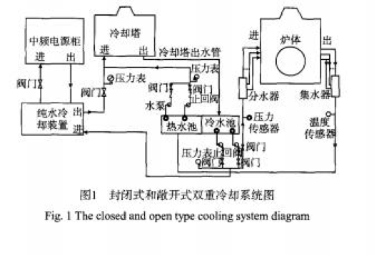 例如圖1是封閉式和敞開式雙重冷卻系統(tǒng)原理圖,主要對中頻電源柜、爐體進(jìn)行冷卻。爐體采用開放式水冷,中頻電源柜采用封閉式水冷。不論采取哪種冷卻方式,為了確保中頻爐生產(chǎn)過程的安全,這些冷卻水路中都必須設(shè)有水溫、水樂監(jiān)測報(bào)警裝置。
