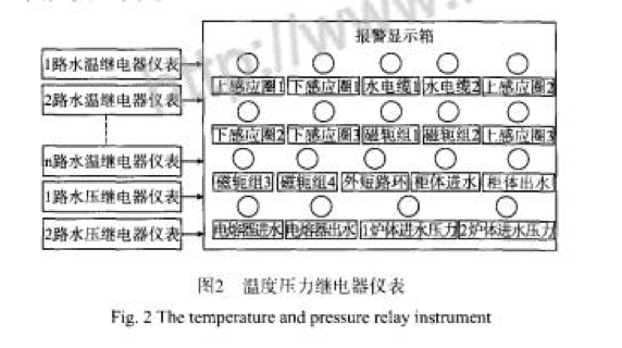 中頻電源的主控板上設(shè)有水溫、水壓超限報(bào)警指示燈,在冷卻水系統(tǒng)通好水后首先調(diào)整水壓繼電器,使主控板上水壓指示燈指示正常。另外在電源柜的進(jìn)水管和m水管及電容器出水管安裝水溫繼電器儀表,爐體出水管各路都要安裝水溫繼電器儀表,爐體進(jìn)水安裝水壓繼電器。所有水溫、水壓繼電器信號連接到報(bào)警顯示箱,當(dāng)某一路超限或有故障時(shí),報(bào)警箱中報(bào)警燈亮,并可發(fā)報(bào)警聲音提示,即可知道哪一條水路有問題,去現(xiàn)場相應(yīng)位置查找故障的原因。原琿框圖如圖2所示。