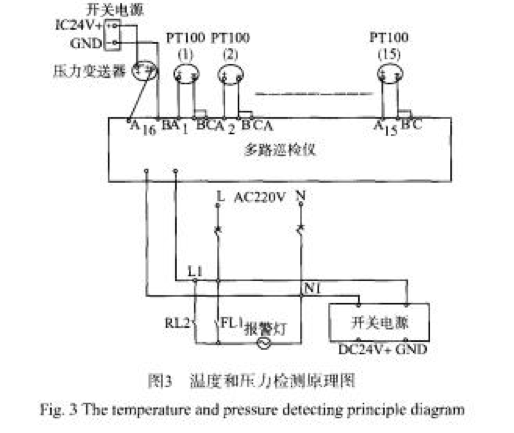 溫度、壓力巡檢儀包括開關(guān)電源、多路巡檢儀、壓力變送器、溫度傳感器、報(bào)警燈等組成??梢愿鶕?jù)用戶的需要選擇相應(yīng)的8—40路巡檢儀,按照圖3進(jìn)行硬件設(shè)計(jì),根據(jù)巡檢儀操作面板進(jìn)行相應(yīng)的設(shè)定,可以設(shè)定多少路數(shù)、下限報(bào)警值、能夠顯示任意一路的設(shè)定溫度和實(shí)際溫度值。當(dāng)某一路發(fā)生報(bào)警時(shí)巡檢儀面板中相應(yīng)的指示燈亮,同時(shí)繼電器輸出報(bào)警燈閃光也可以進(jìn)行遠(yuǎn)傳報(bào)警信號,能夠?qū)崿F(xiàn)本地控制和遠(yuǎn)傳功能。