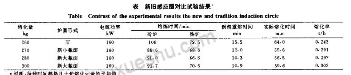 經(jīng)過更換中頻電爐感應圈,改接電容器,完成了電爐的改造。在清華大學機械廠沙河分廠進行了新舊爐型的對比試驗。熔化材料為玲激合金鑄鐵,鐵水溫度1480℃。試驗結果見下表。